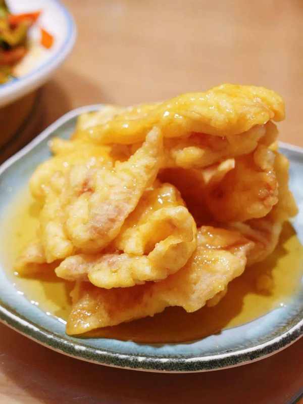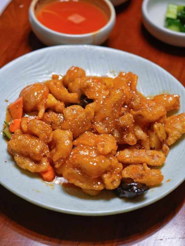 韩式锅包肉我挺喜欢,和传统的锅包肉不太一样,这是切成小块的,里面还有菠萝。酸酸甜甜。