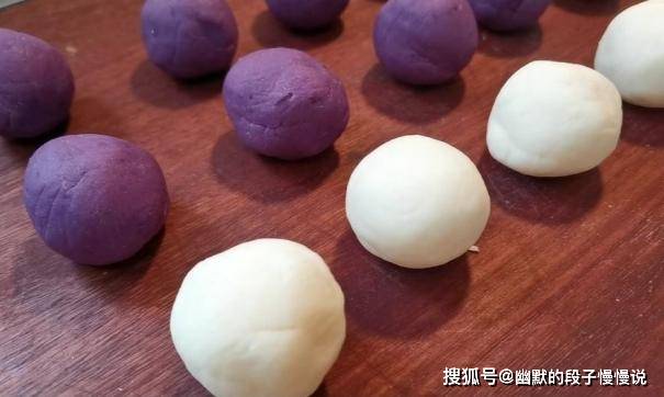 4、取一小坨山药泥,再取一小坨紫薯泥,将两者混合在一起,搓成圆形。搓好以后表面沾一层椰蓉,既能防止山药粘连,又能增加香味。