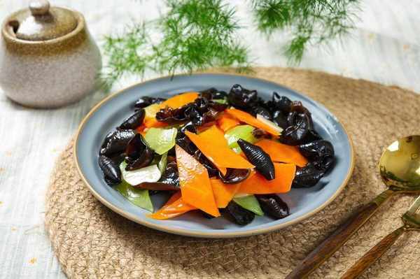 食材:莴笋,黑木耳,胡萝卜,植物油,盐,大蒜。