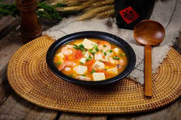 材料:鲜虾150克、豆腐1块、青菜、鸡蛋1个、姜片、葱、鸡汤500毫升、盐适量