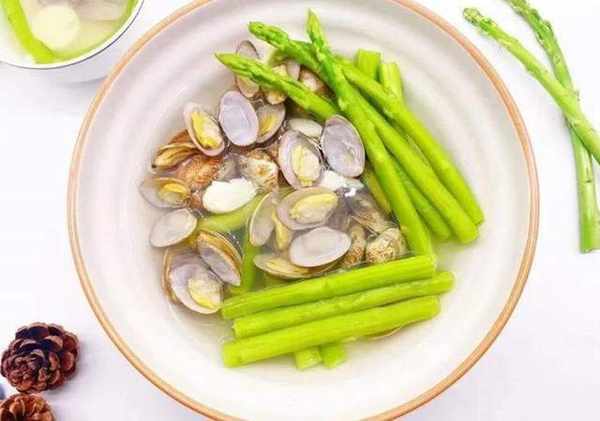 3、待蛤蜊壳开后,将芦笋放入锅中煮至软烂。