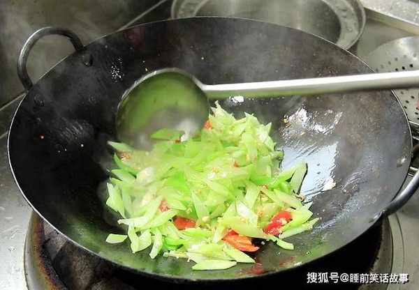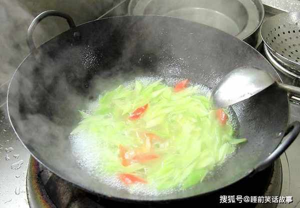 3.锅内烧油,油温六成热,油面冒青烟的时候,倒入切好的秋葵,快速滑油5秒钟倒出控油,滑油能使秋葵的口感更加的脆嫩,还能防止秋葵粘液溢出。