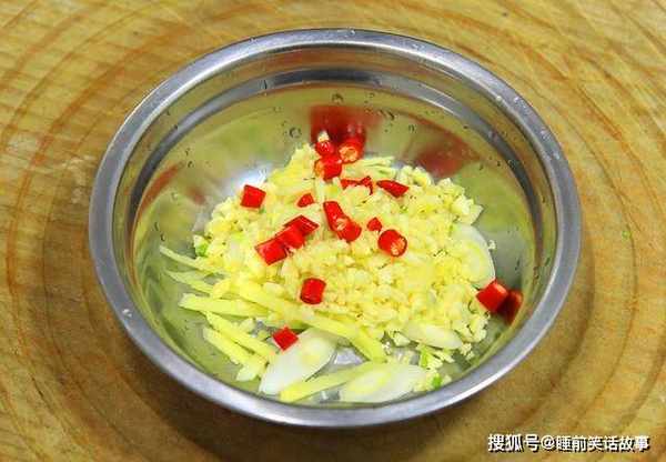 2.准备大葱一根切成葱花,生姜一小块切成姜丝,大蒜一把拍扁切成蒜末,小米椒几粒切成粒,红椒半片切成菱形片,青椒半片切成菱形片。