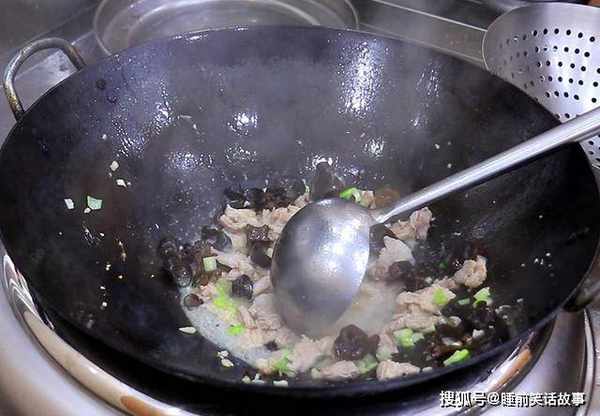 3.把锅烧热,加入植物油滑锅,滑好锅以后倒出热油加入凉油,把肉片放入锅中,煸炒出里面的肥油,肉片炒白炒香以后,放入泡发的木耳和葱蒜末,一起翻炒出葱香味,倒入一勺清水。