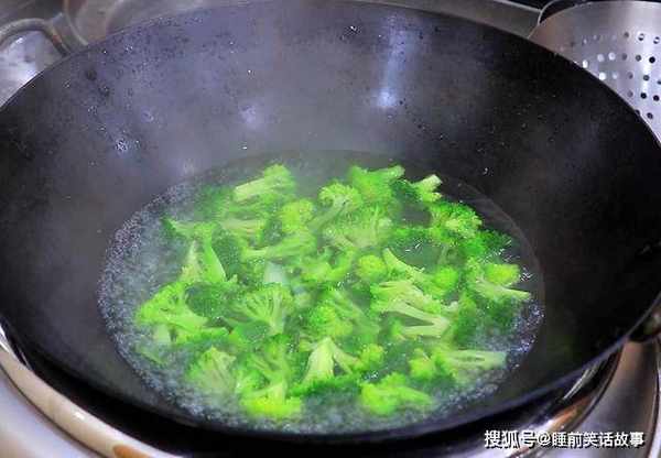 2.锅中烧水,水烧开以后加入一勺食盐入底味,把西兰花倒入锅中烫30秒钟,西兰花返青以后倒出来,过一下凉水以免回软。