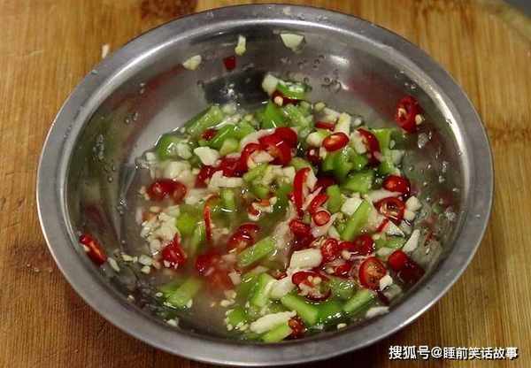 2.准备青椒半个,去籽后切成颗粒,小米椒几个切成圈,大蒜几粒,用力拍散再成蒜末,加入食盐2克,白醋10克,搅拌化开以后备用。
