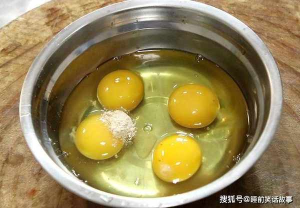 2.盆中打入四个鸡蛋,加入食盐2克,鸡粉1克,快速搅拌打散备用。