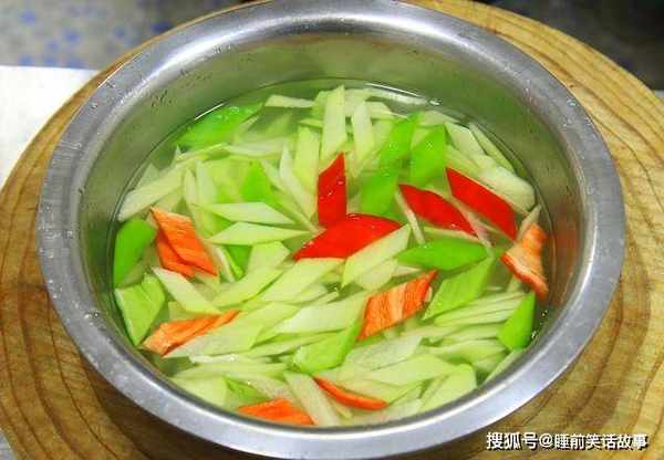 3.锅内烧水,淋入一点植物油,加入食盐2克,再倒入一点白醋,水烧开以后倒入佛手瓜和青红椒片快速焯一下水,捞出来用凉水冲洗,保持佛手瓜的脆感。