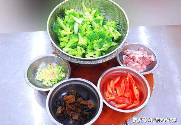 1.准备适量的木耳,放在清水中泡发。一块五花肉,切成均匀的薄片。大葱破开切成葱花,大蒜拍扁切成末,一朵西兰花,切成小块放在清水中洗干净,红椒一个切成菱形片。