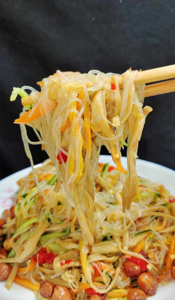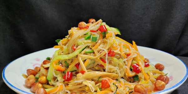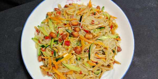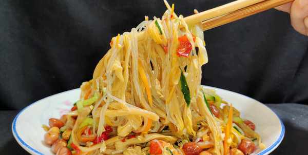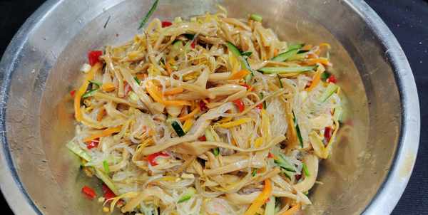 第六步:将所有食材,黄花菜,黄瓜丝,胡萝卜丝,粉丝都放入盆中,浇入调好的料汁抓拌均匀就可以吃了。