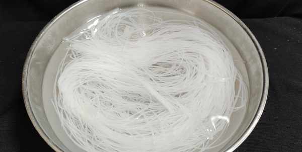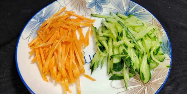 第二步:准备黄瓜半根切丝,胡萝卜一小块也切丝备用。龙口粉丝用开水泡软备用。