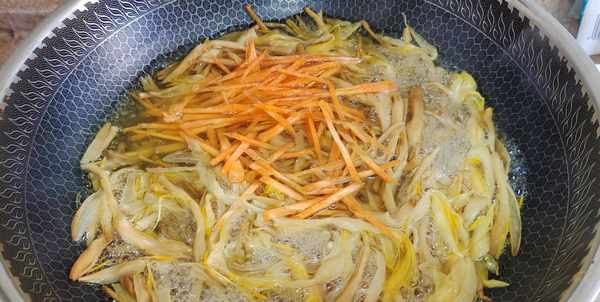 第三步:锅里烧开水,将黄花菜和胡萝卜丝一块下锅焯烫熟透,捞出后过凉开水进行冷却,而后再挤干水分,抖散开来放入盆中备用。