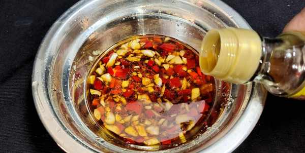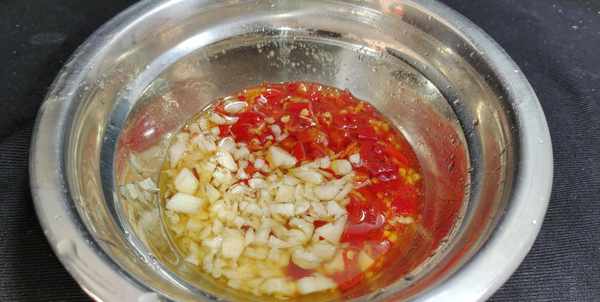 第四步:来准备料汁,空碗中加入剁辣椒两汤匙,没有剁辣椒的可以用干辣椒和新鲜的小米椒代替,再加入蒜末适量,而后烧热油浇进去激发出香味。