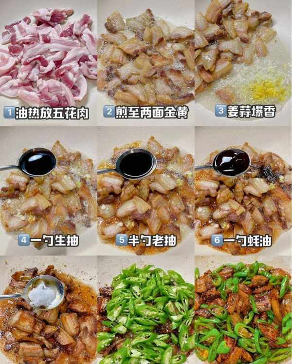 食材:五花肉、辣椒、姜、蒜、酱油、蚝油