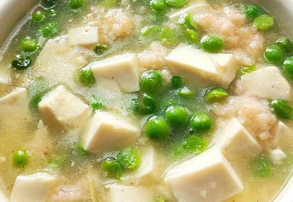 准备食材:虾仁,豆腐,豌豆粒,姜丝,葱花。