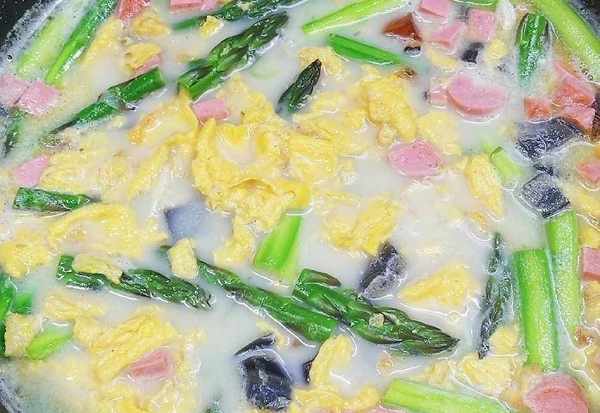 5、再放入芦笋和鸡蛋,煮至汤汁变白,就可以倒入一点牛奶,加入食盐和胡椒粉调味,搅匀煮入味即可出锅开吃。