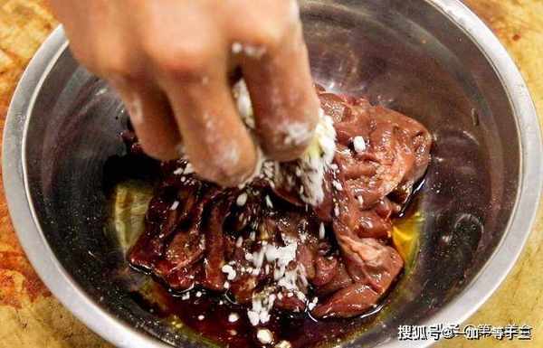 1.首先我们准备一下食材,猪肝一块,在清水中洗净后捞出,切成均匀薄片,放入盆中,加入食盐1克、白糖少许 、胡椒粉1克、老抽3克调色、料酒5克去腥味。再抓入少许淀粉,淀粉能锁住猪肝中的水分,口感更嫩,抓拌均匀,腌制10分钟,让猪肝吸收料汁入味。