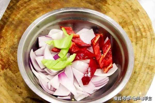 2.洋葱一个,切成均匀小块,掰开后放入盆中,青红椒各一片,斜刀切成片,和洋葱放在一起,用来搭配颜色。