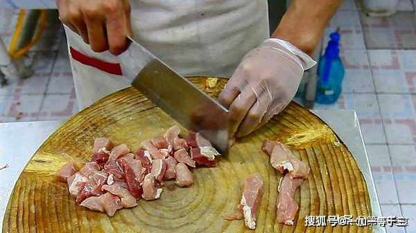 瘦肉一块,顺着肉的纹理,先切成厚片,再切成方条,然后切成丁。