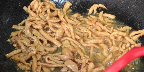 步骤四:锅中烧油,油多一点,四成油温下入肉丝,快速滑散,肉的颜色变白,捞出控油。