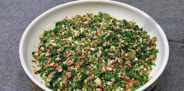 步骤一:荠菜处理干净,清洗干净。锅中烧水,加一勺盐、一勺食用油,水开放入荠菜,焯水一分钟捞出过凉水,防止荠菜变色,挤干水分,再把荠菜切碎。