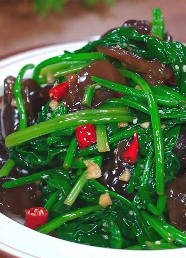 食材准备:菠菜、木耳、大蒜、生抽、辣椒、芝麻、盐、白糖、陈醋、香油等。