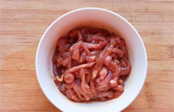 步骤一:一块猪瘦肉切丝,加盐、料酒、一个鸡蛋清、一勺淀粉,抓拌均匀,腌制十分钟。