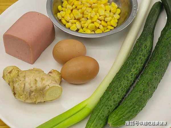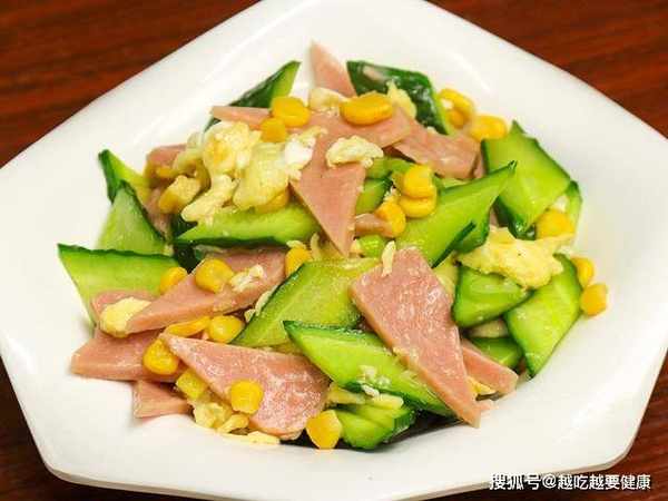 黄瓜切成菱形片;午餐肉或者火腿切成片;盆中打入三个鸡蛋,加入少许食盐、一勺鸡粉搅拌打散成蛋液。