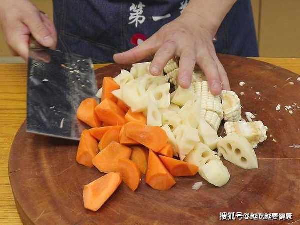 选择比较嫩的小排,从中间劈开剁成块,把胡萝卜、莲藕都切成均匀的滚刀块;玉米也砍成块切好以后放在盆中备用。