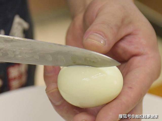 准备生鸡蛋凉水下锅,加入一勺盐,大火烧开煮5分钟捞出鸡蛋,冲凉剥开蛋壳,用刀在鸡蛋上竖向划几道。
