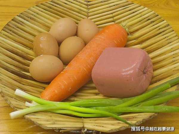 小葱切成葱花、火腿切成碎丁、胡萝卜也切成碎丁,切好以后全部放在同一个盆中。