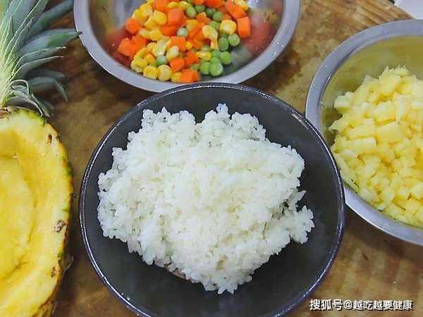 菠萝半个切去根部,把中间的菠萝肉挖出来,然后把菠萝肉切成小粒放在盆中备用;准备一个小盆放入豌豆粒、胡萝卜粒和玉米粒备用;盆中打入一个鸡蛋搅散备用;蒸熟的大米饭一碗备用。
