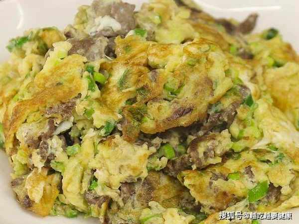 锅内再烧油,油温烧至六成热的时候倒入葱花鸡蛋液,鸡蛋液逐渐凝固定型时把牛肉倒在鸡蛋上面,开小火像煎蛋饼一样,等到底面定型以后翻面。鸡蛋煎至两面金黄用勺子抖散,再淋入一点清水开大火翻炒至水分全部收干即可出锅装盘。