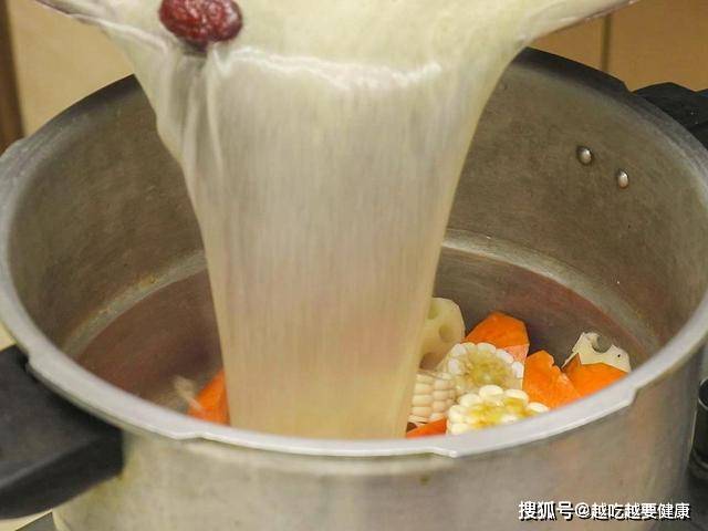 取出高压锅放入莲藕、玉米、胡萝卜、再倒入排骨,先大火烧至上气再转小火炖煮20分钟。时间到后放气打开锅盖,这个时候再调味加入食盐、少许白糖、胡椒粉、鸡粉搅匀就能出锅了。