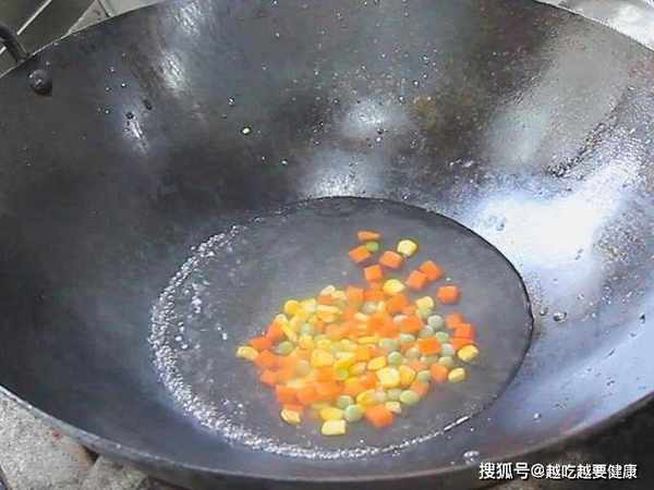 锅内烧水,倒入豌豆粒、胡萝卜粒和玉米粒,水烧开以后煮30秒,倒出控干水分备用。