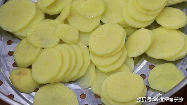 土豆洗净切成均匀薄片,尽量切的薄一点,更容易蒸熟,把切好的土豆片放入蒸笼里面。
