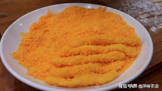 我们把做好的薯条,先裹上鸡蛋液,再粘一层面包糠,这样薯条的生坯就做好了。