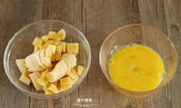 1、我们把准备好的香蕉去皮,然后切成小块,然后找一个碗,把鸡蛋打进去拌匀;