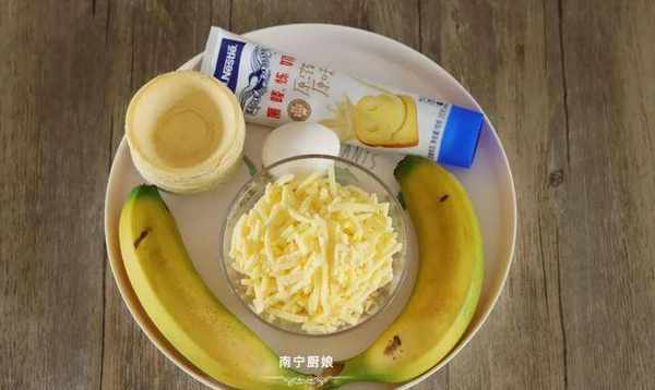 香蕉2条、鸡蛋1个、芝士碎50克、炼乳30克、蛋挞6个、熟黑芝麻适量