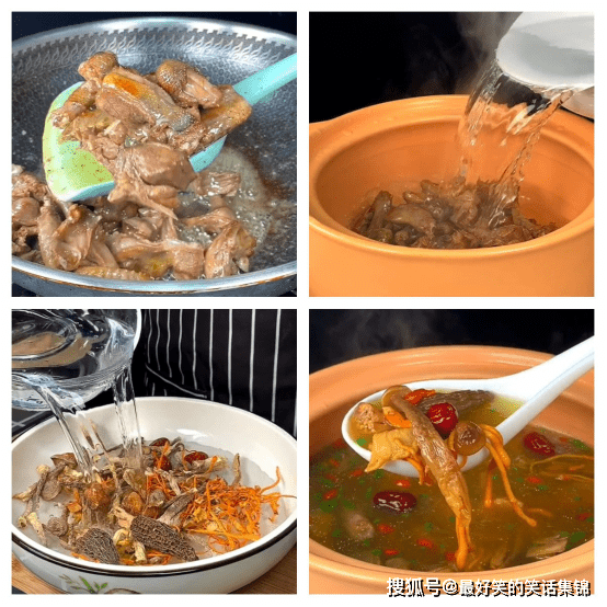 3、接下来准备一包松茸菌汤包,配料为姬松茸、鸡油菌、羊肚菌、鹿茸菇、虫草花、大枣、枸杞,加点清水淘洗干净,洗好后倒入砂锅中,并改为小火,再扣盖炖煮半个小时。