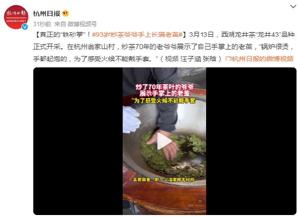 3月13日,西湖龙井茶正式开采。在杭州翁家山村,炒茶70年的老爷爷展示了自己手掌上的老茧,“锅炉很烫,手都起泡的,为了感受火候不能戴手套。”