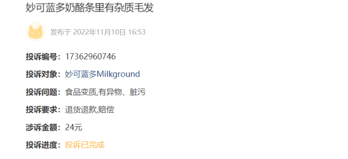 而在妙可蓝多的一款奶酪条产品中,也因含有杂质毛发,而被消费者投诉。