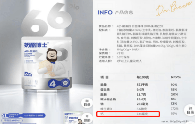 其次,干酪和再制干酪在钙的含量上也有差别,100g干酪的钙质含量为799 mg。而不同品牌的奶酪棒,在同样100g的情况下,钙含量却相差悬殊。