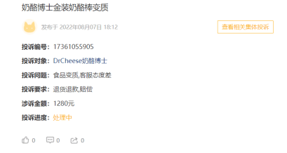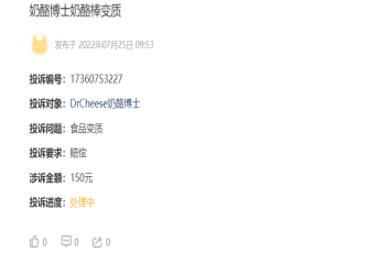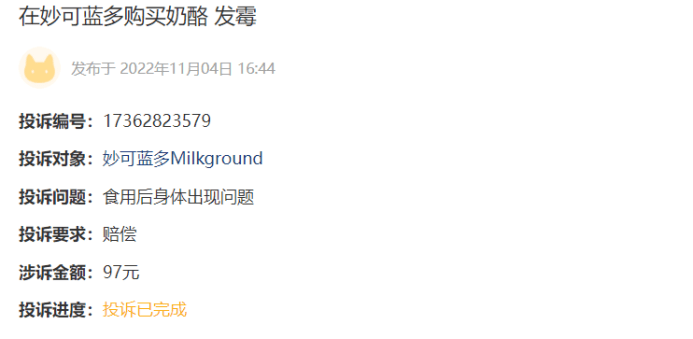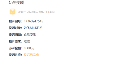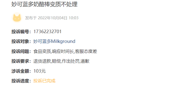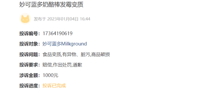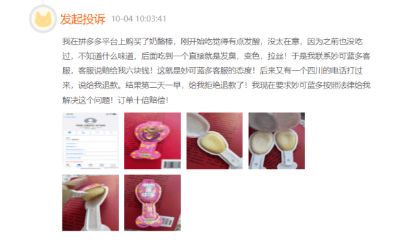 此外,奶酪博士和妙飞也同样存在因产品出现变质问题,而被消费者投诉的现象。