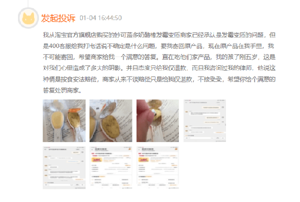 而在另外一则关于妙可蓝多的投诉中,消费者则表示,商家已经承认发霉变质的问题,但400客服联系消费者,要求消费者将原产品寄回,但消费者基于留存证据,并未寄回,而这也导致了后续陷入维权困境。