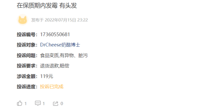以奶酪博士为例,有消费者反映其产品在保质期内发霉,且产品包装中有头发。