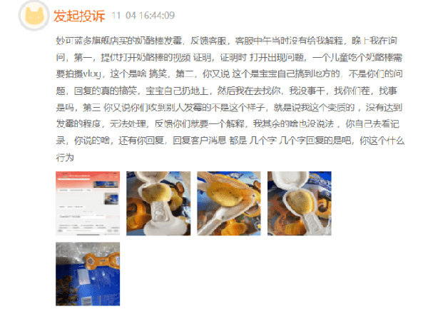 比如有消费者反映,在妙可蓝多旗舰店购买的奶酪棒发霉,反馈给客服后,客服需要消费者向其提供奶酪棒的开箱视频,商家还表示消费者拍照所显示的情况,或为家里宝宝自己把奶酪棒丢到地上所导致的。
