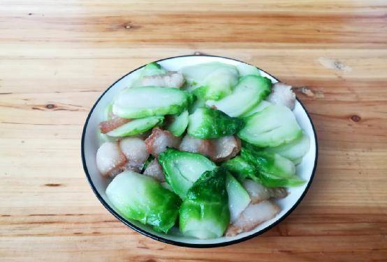 3、油锅烧热,加入适量的油,将猪肉翻炒至微黄,蔬菜翻炒至熟透,加少许盐调味。
