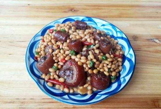 【黄豆炒猪尾】材料:猪尾一根,黄豆半碗,辣椒适量,调料:食用油适量,盐适量,炸酱油适量。