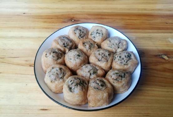 2、炸豆腐撕破洞,填入肉末,放入开水锅中蒸20分钟。